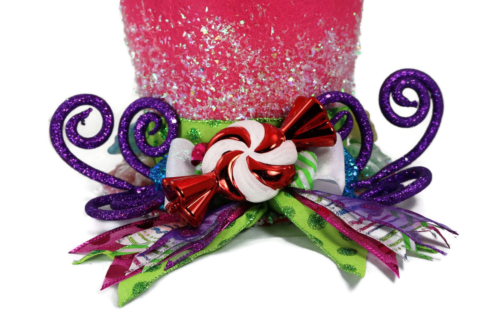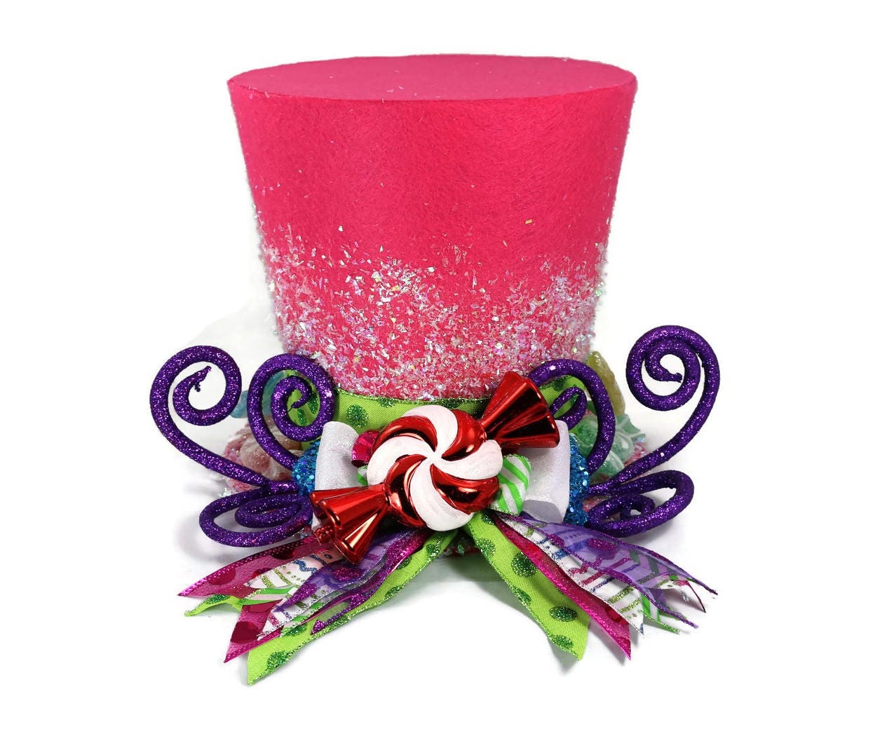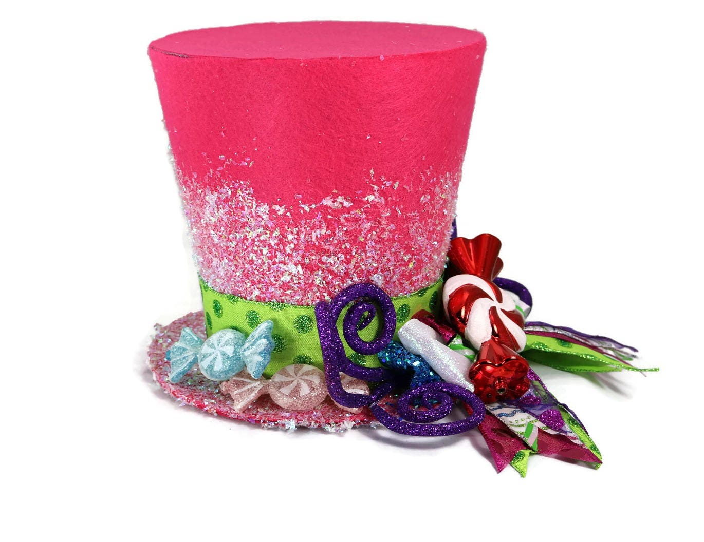 Sweeten your holiday this year with a Candy Christmas tree. This brightly colored whimsical top hat is perfect as a tree topper, table decoration, you can even use it as a vase for your centerpiece on a table. Hold flowers (vase is needed to preserve the condition of the hat) A Candy Christmas tree theme has whimsical appeal, and as long as the kiddies don't try to take a small taste, your sugary sweet ornaments will be eye candy all season long